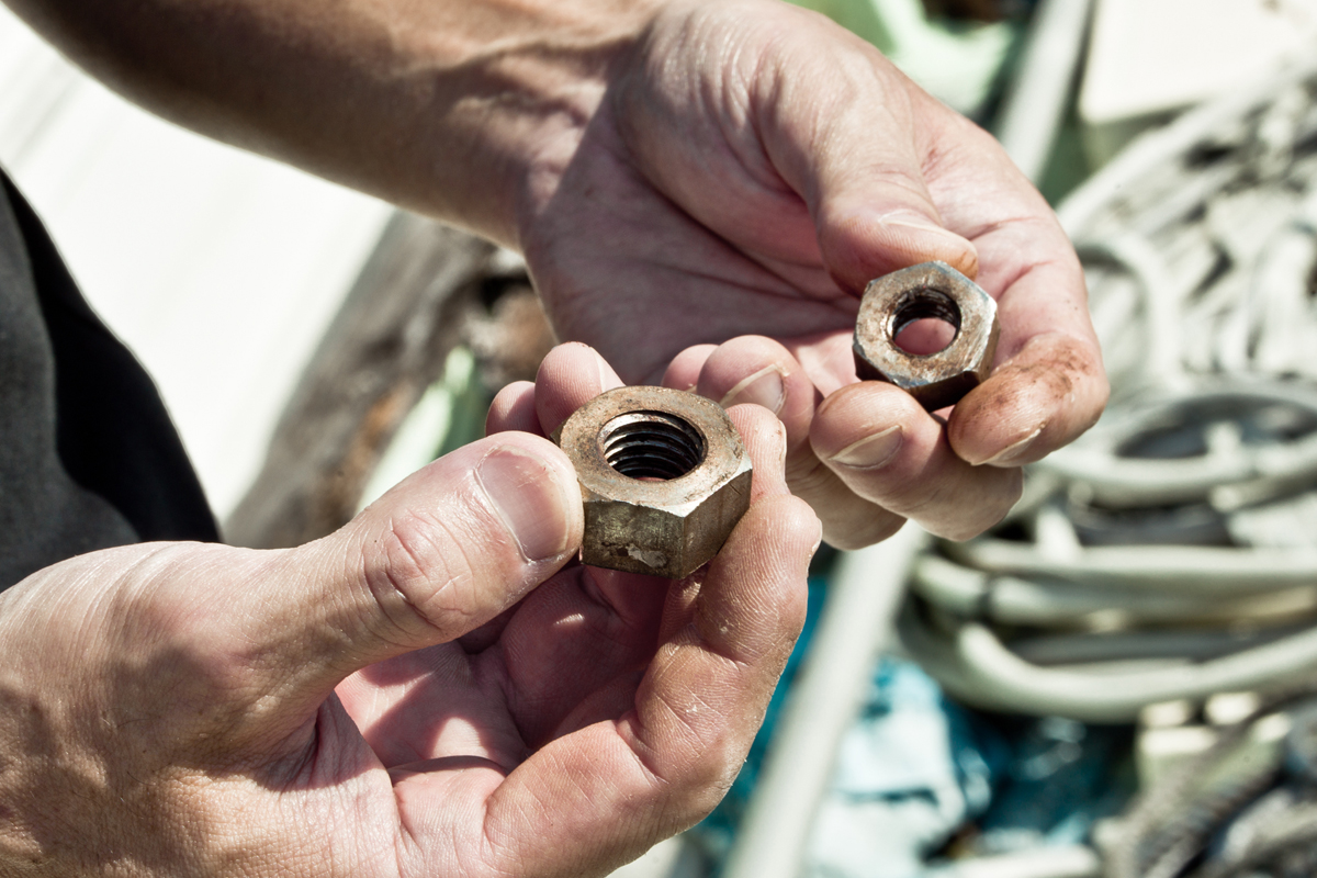 大きなスパナを用意して港へ出向いて船に乗り込むと、あらかじめ目星を付けていたナットへスパナを掛ける。何十年も船の部品を締め付けていたナットだけにさぞかし手強いだろうと想像していたのだが、意外と手こずることなく取り外すことができた。